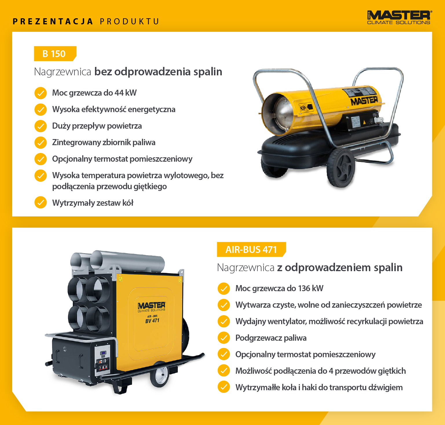Master jest dobrze znaną marką na świecie w zakresie przenośnych rozwiązań do kontroli klimatu. W ciągu 60 lat od założenia firmy stworzyliśmy gamę solidnych nagrzewnic z odprowadzeniem spalin oraz bez odprowadzenia, które charakteryzuje niezawodność, zrównoważony rozwój, wydajność i użyteczność.