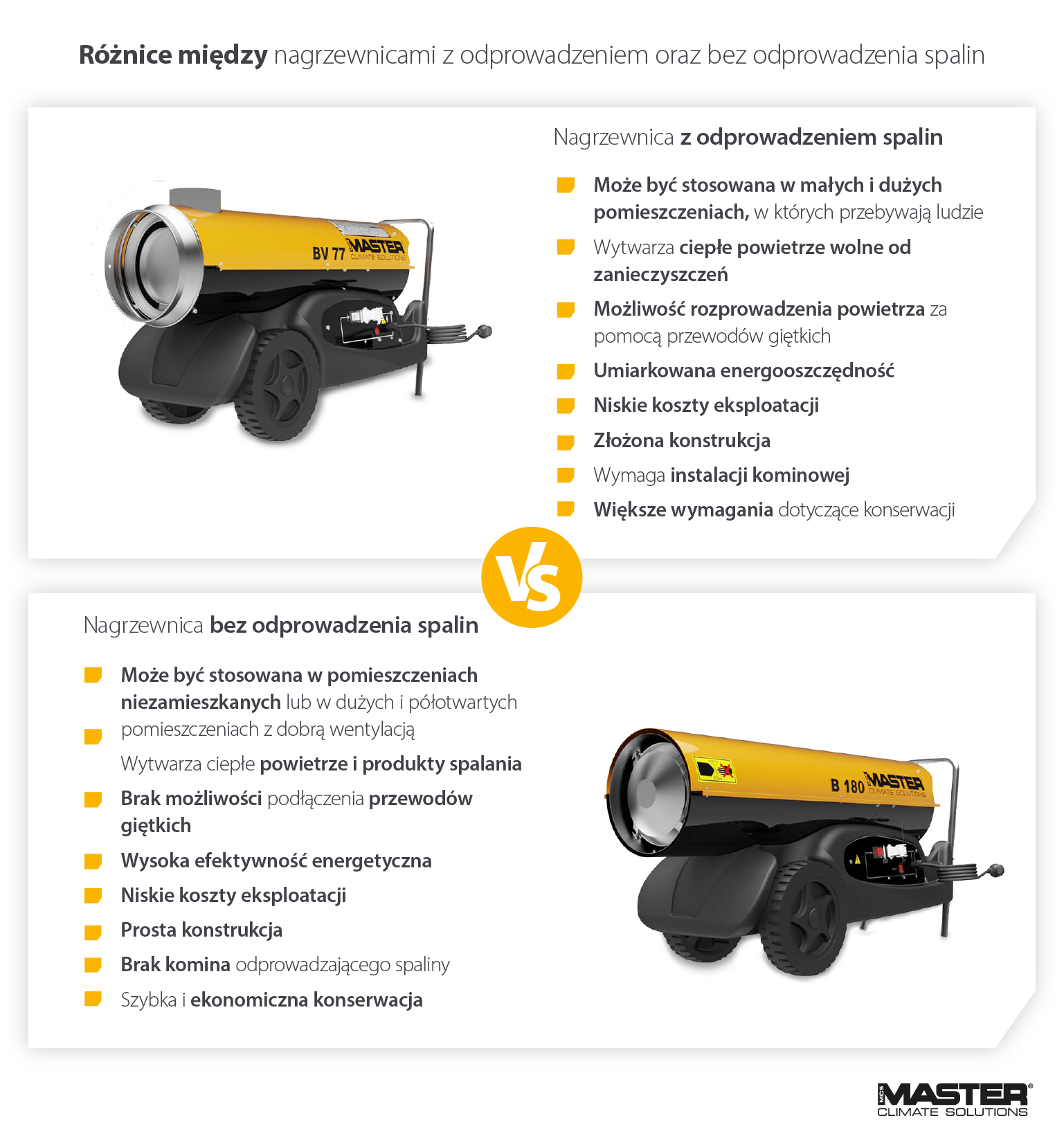 Mimo, że nagrzewnice bez odprowadzenia i z odprowadzeniem spalin są pod wieloma względami podobne, istnieje wiele różnic pomiędzy każdym z tych typów urządzeń.