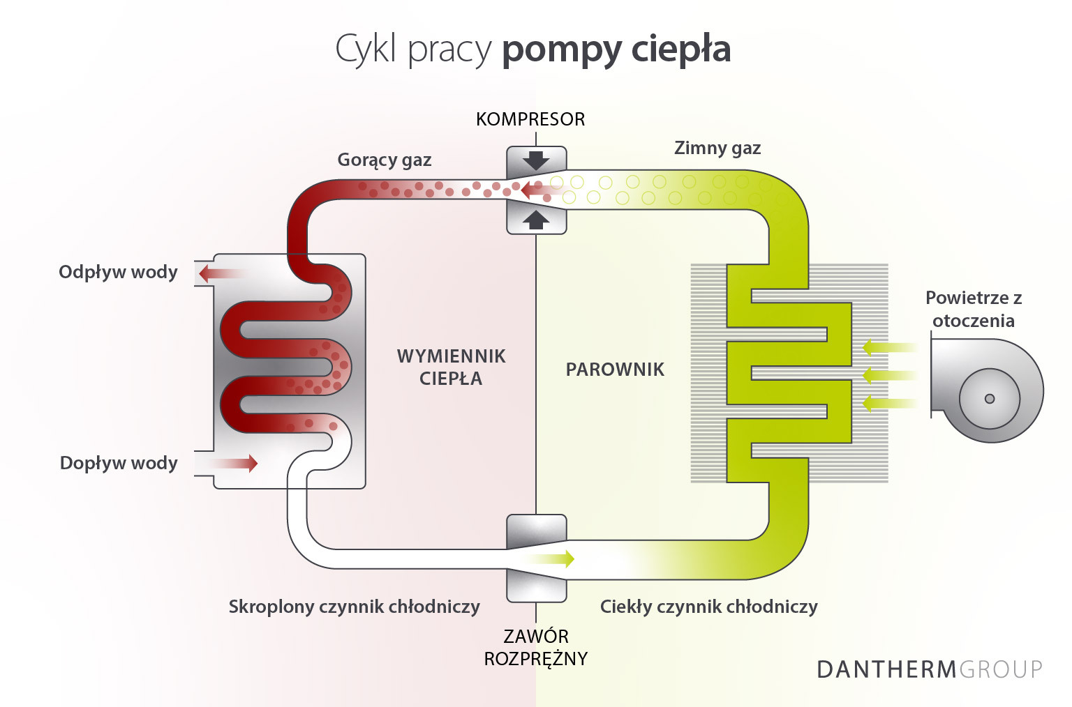 Pompa ciepła wykorzystuje energię elektryczną i czynnik chłodniczy do przenoszenia ciepła z jednego miejsca do drugiego. Aby zapewnić ciepło, pobiera ciepło z powietrza zewnętrznego i przekazuje je do czynnika chłodniczego — które jest następnie sprężane, co znacząco zwiększa temperaturę. Teraz gorący płyn chłodzący jest następnie przenoszony do pompy ciepła po stronie wody basenowej, która następnie przepuszcza wodę basenową przez rurociąg zawierający gorący płyn chłodzący, zwiększając temperaturę wody w basenie.