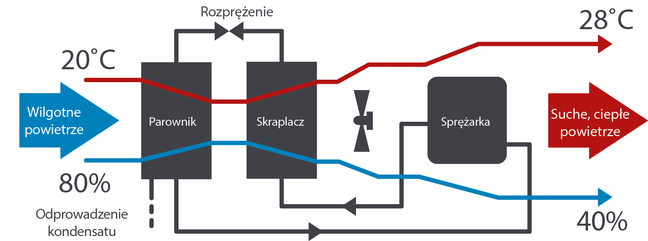 Ciepłe, suche powietrze jest następnie zwracane do pomieszczenia przy wymaganej wilgotności