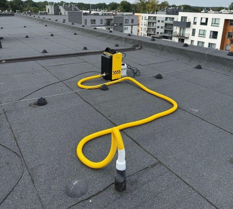 - Przygotowanie: Na dachu o powierzchni ponad 400 m2 wykonano około 10 odwiertów. Urządzenie FS 200, dzięki swojej lekkiej konstrukcji było dowolnie przemieszczane w zależności od potrzeb tak, aby łatwo było podłączyć wąż elastyczny do otworu i wprowadzić wygenerowany dym.