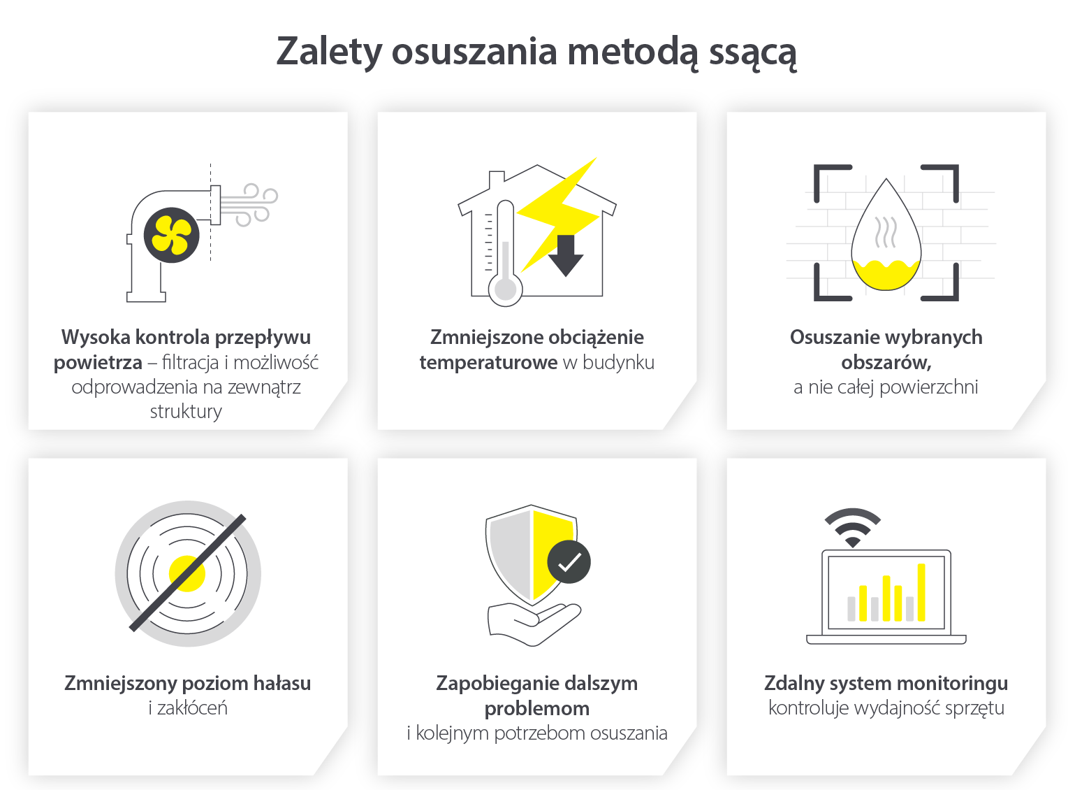 Osuszanie metodą ssącą umożliwia wykonawcom stałe monitorowanie procesu osuszania za pomocą takich systemów, jak zdalny monitoring, w którym wystarczy umieścić sondy temperatury i wilgotności w przewodach odprowadzających powietrze z izolowanej konstrukcji.