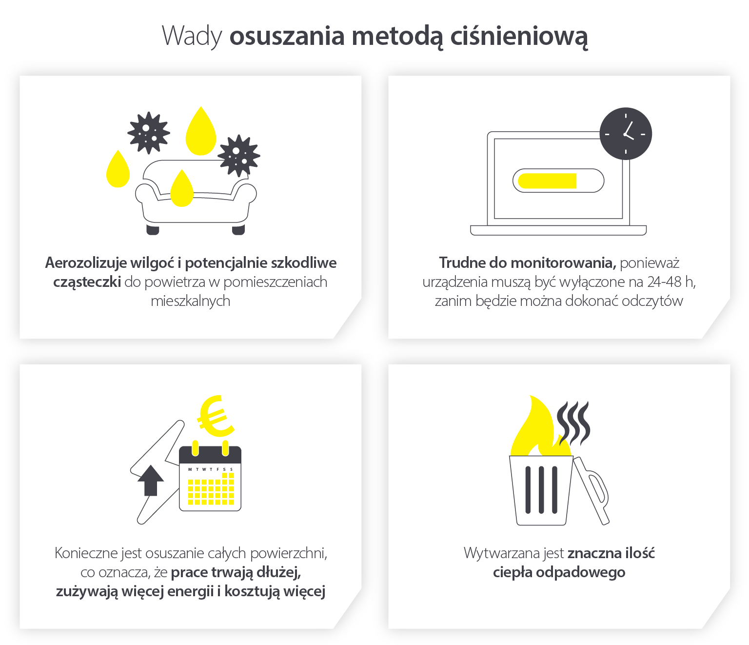 Dawniej wykonawcy stosowali nadciśnieniowe metody osuszania, które wymuszały przepływ powietrza pod wysokim ciśnieniem do wnętrza konstrukcji, które następnie wydostawało się z powrotem do pomieszczenia, unosząc ze sobą wilgoć. Niestety, ten strumień powietrza przenosił również wszelkie szkodliwe materiały ukryte w konstrukcji, potencjalnie rozprzestrzeniając je w powietrzu znajdującym się w pomieszczeniu mieszkalnym.