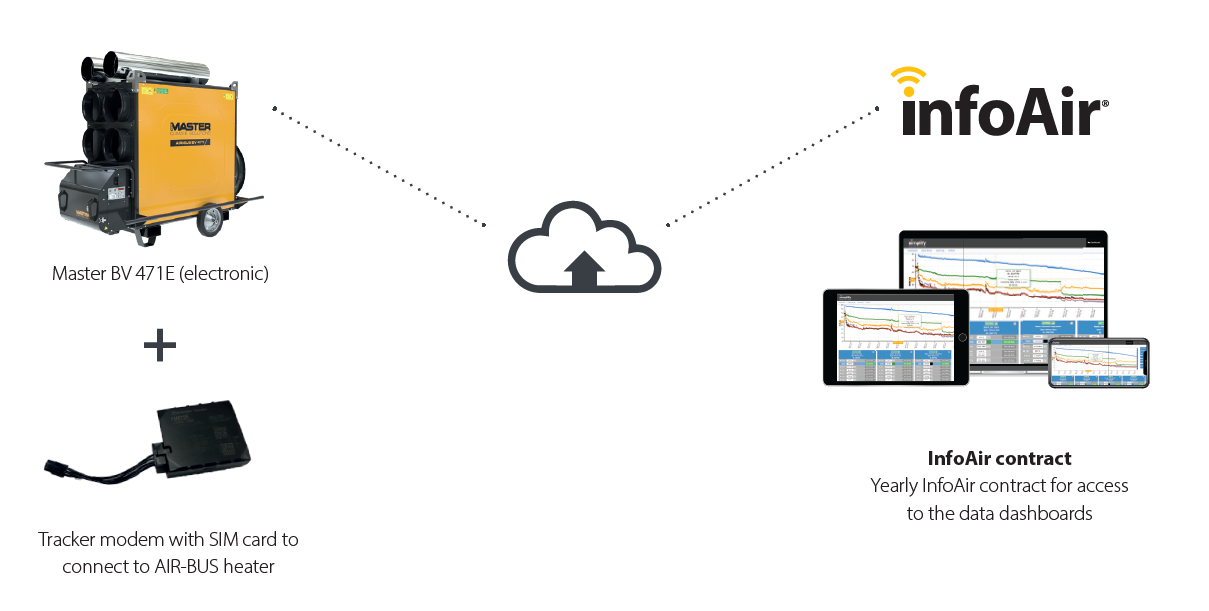 InfoAir to wszechstronny system zdalnego monitorowania zaprojektowany z myślą o usprawnieniu korzystania z przenośnych nagrzewnic powietrza, które są stosowane w wielu branżach. Bez możliwości komunikacji zdalnej wymagają one regularnych fizycznych wizyt w miejscu pracy w celu sprawdzenia ich działania. InfoAir rozwiązuje ten problem i oferuje szereg korzyści. Upraszcza zarządzanie flotą, dostarczając w czasie rzeczywistym dane o wydajności i stanie operacyjnym z dowolnego miejsca. Zdalne alerty w przypadku przestoju, niskiego poziomu paliwa, zbliżających się wymagań serwisowych/konserwacyjnych lub podobnych minimalizują przerwy w pracy i zapewniają komfort użytkowania.