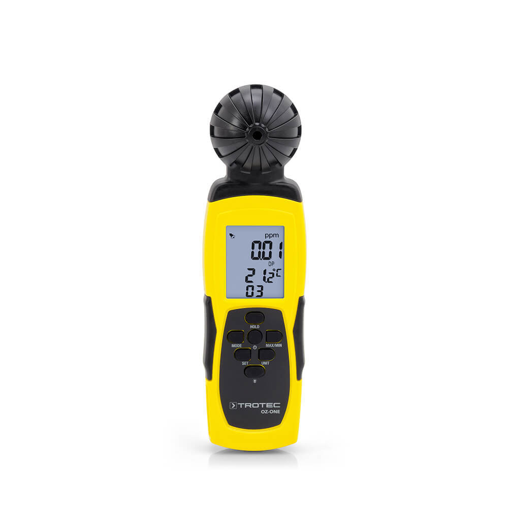 Many integrated functions such as the ozone zero adjustment, the reference value measuring option for short-term exposure limit (STEL) and time-weighted average (TWA), or the value display, switchable from ppm to µg/m³ and vice versa, make the quickly responding OZ-ONE an indispensable tool for precise ozone exposure measurements. Moreover, this device is a compact portable environmental measuring device for the determination of air temperature and humidity or the calculation of dew point and wet-bulb temperature. The dual display of this measuring device always shows you two measured values at a time, visible at a glance.