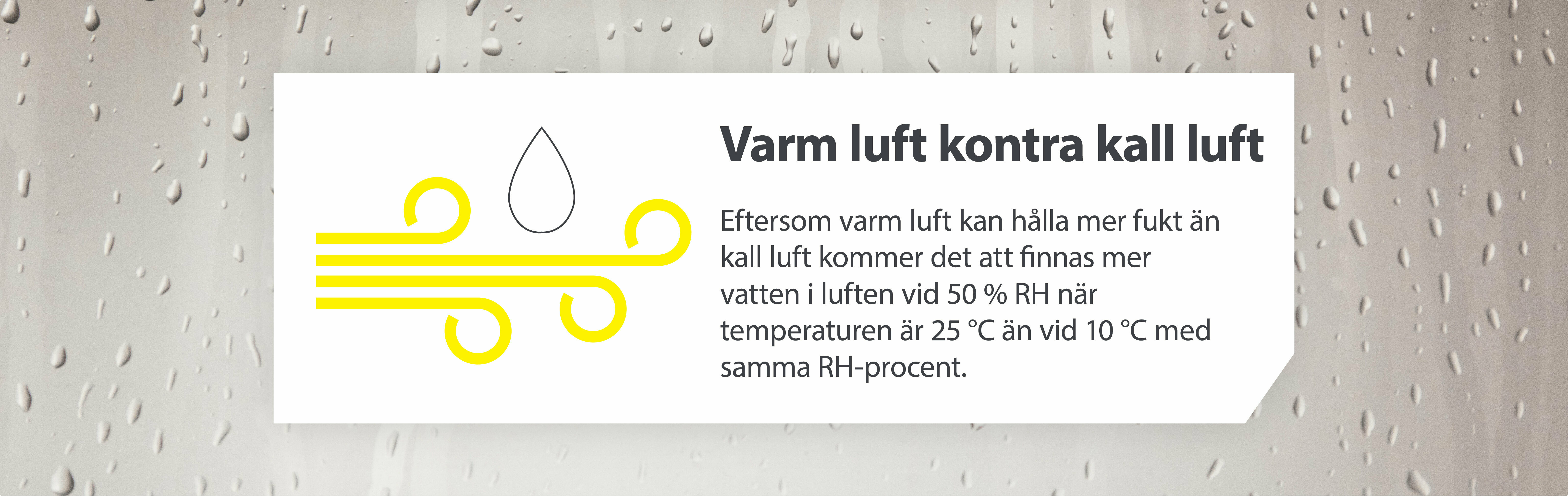 Det viktigaste är den relativa luftfuktigheten (RH). Detta är en enhet (anges i procent) som specificerar mängden vattenånga i luften i förhållande till mängden vattenånga som luften kan hålla kvar vid aktuell temperatur.