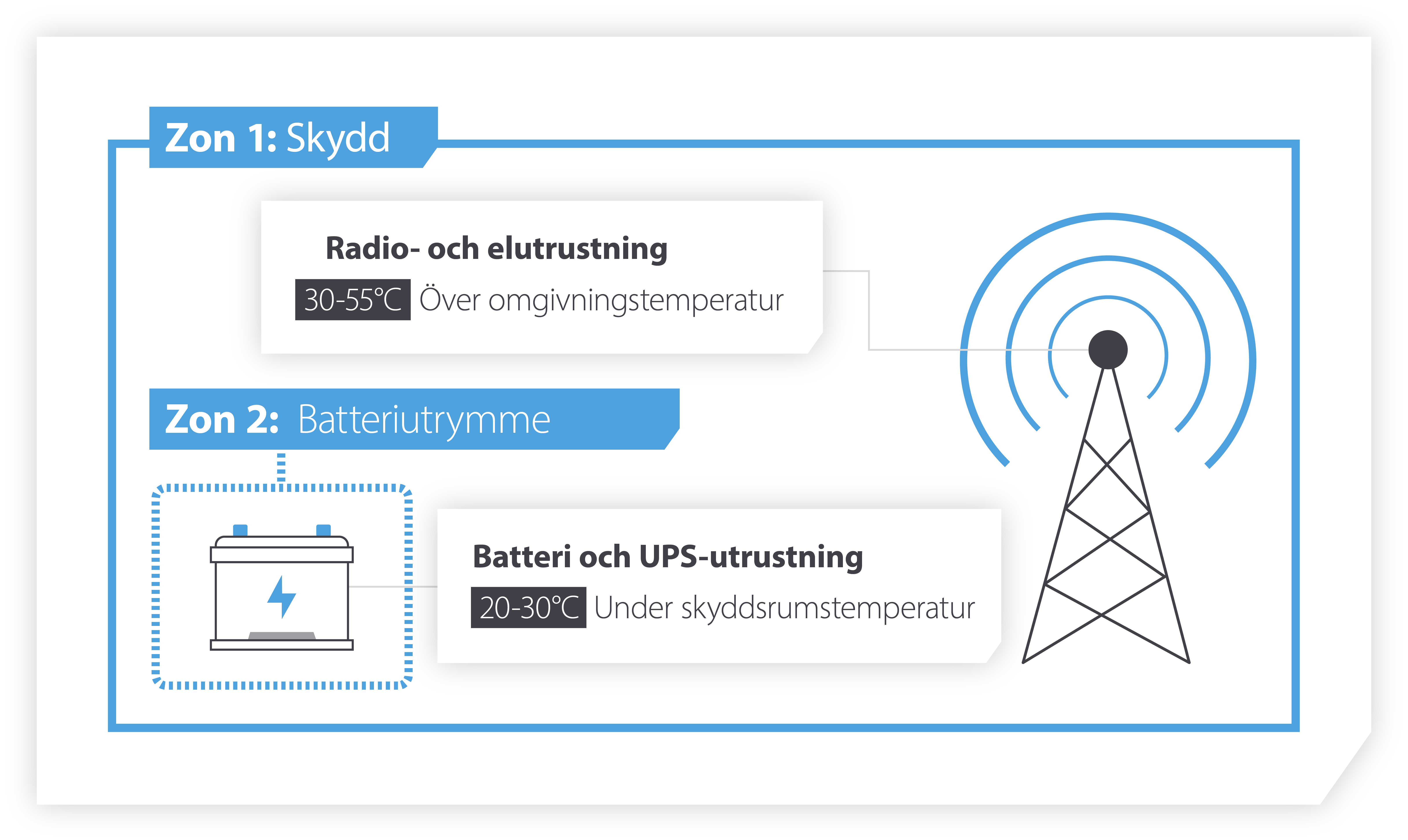 Huvudanläggningen (zon 1) kan höjas till 38 °C utan att radioutrustningen skadas medan batterilådan (zon 2) kyls till 23 °C.