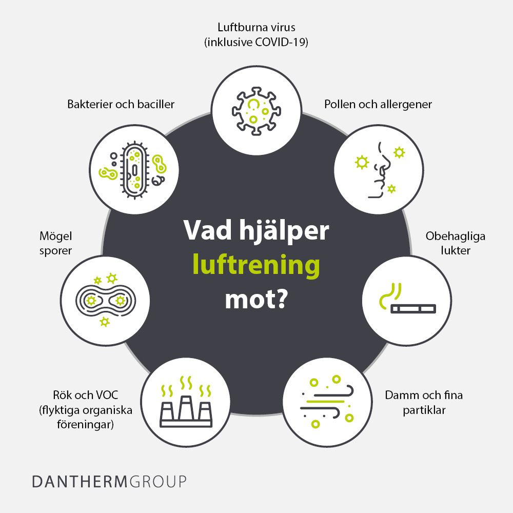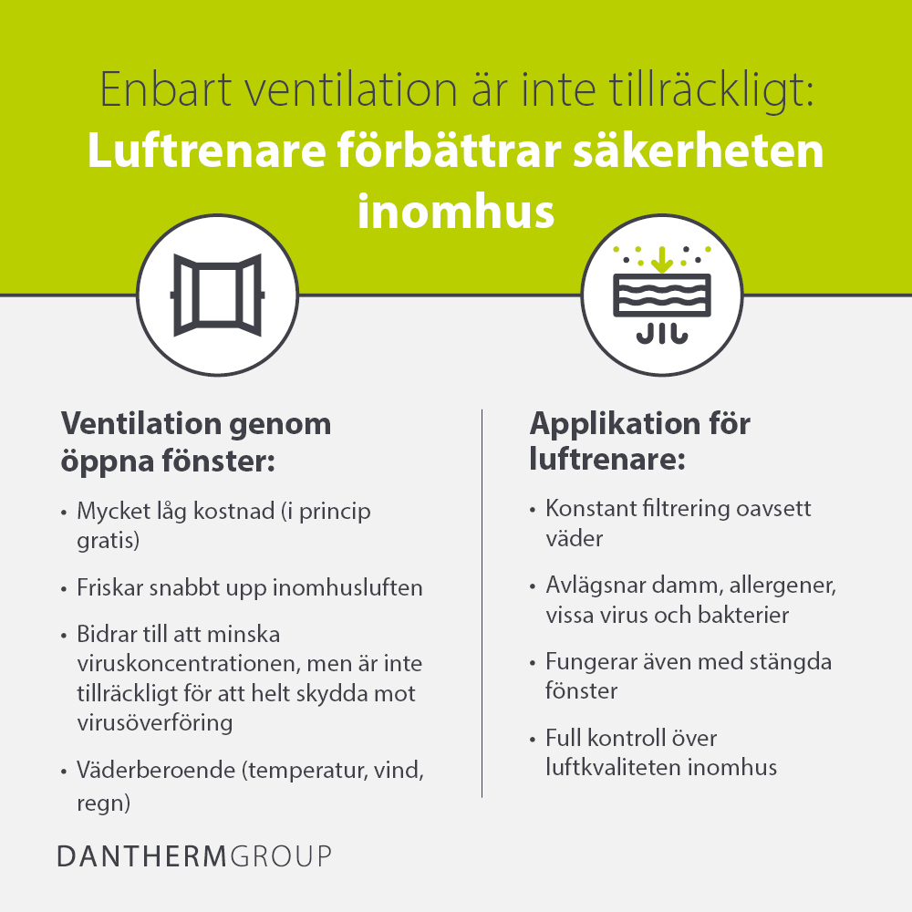 Den vanligaste metoden för att bli av med luftburna virus är att ventilera och byta ut luften inomhus genom att regelbundet öppna fönstren. Eftersom influensasäsongen sammanfaller med den kalla årstiden är detta dock inte alltid en särskilt energieffektiv metod. Luftrenare suger in förorenad eller infekterad luft och släpper ut varm ren luft, vilket bidrar till att spara värmeenergi. Luftrenare för hemmabruk kan vara mycket energieffektiva med en strömförbrukning på mindre än 0,2 kW vid en luftvolym på mer än 1 000 m³/h.