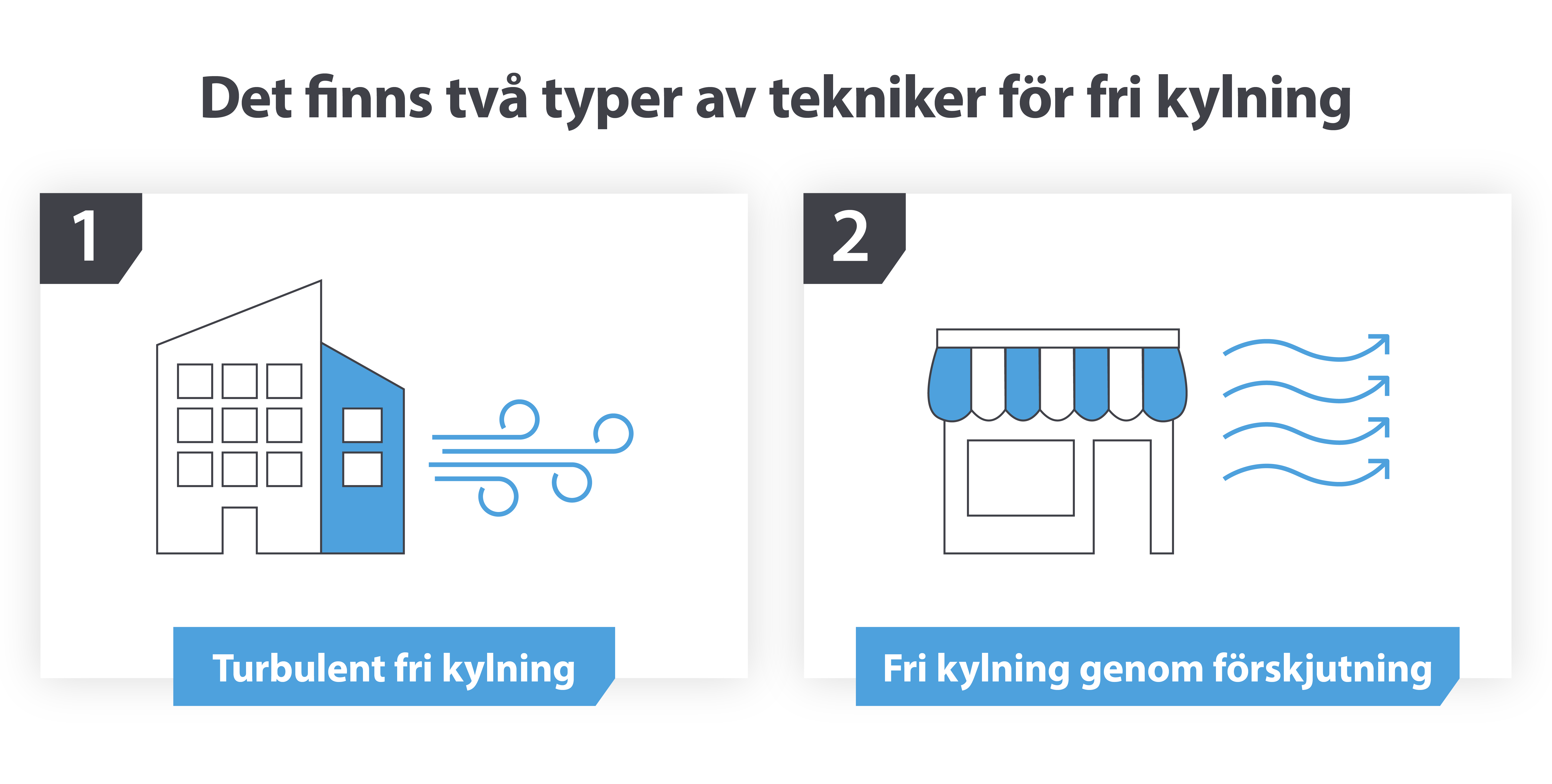 Det mest populära alternativet för större byggnader eller utomhusskåp som rymmer mer teknisk utrustning med större värmebelastning. Turbulent frikyla cirkulerar sval uteluft i ett utrymme. Detta ger samma mängd kylning i varenda hörn av utrymmet innan luften extraheras.