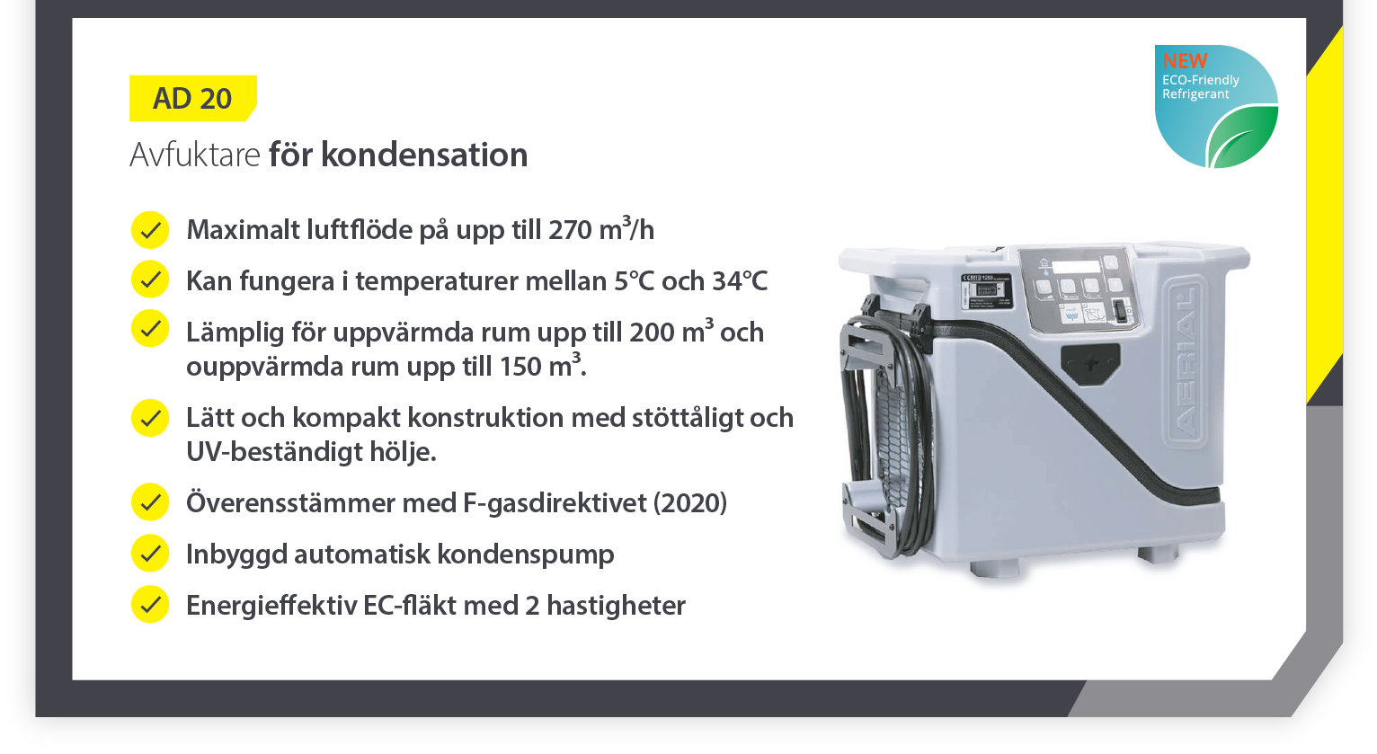 Enheter som AD 20 är inte bara effektiva kondensavfuktare, de är också lätta att underhålla, byggda för att hålla länge och mycket energieffektiva - idealiska för många situationer.