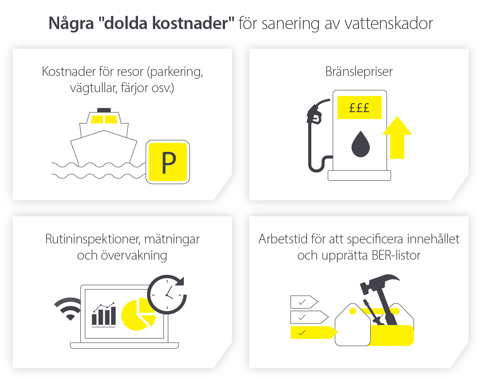 Detta tar även hänsyn till skador på möbler, inventarier och andra föremål som inte bara är vatteninträngning i själva byggnadsstrukturen.