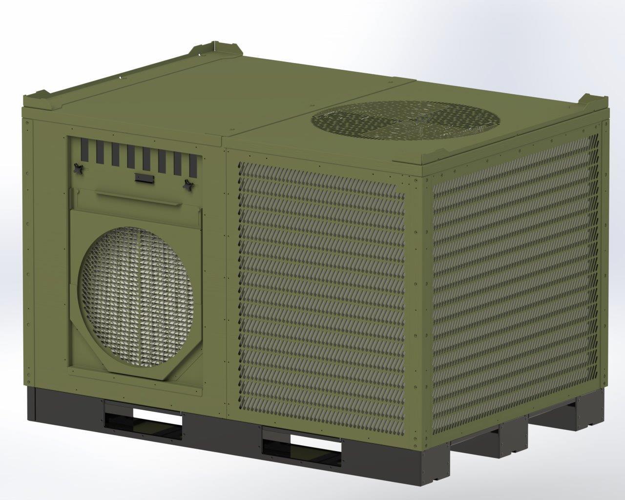 The AC-M25 unit is designed and manufactured to provide air conditioning and heating in deployable tents, shelters and temporary buildings. It is a powerful, compact unit made from aluminum sheet metal and built into a rigid steel frame. The unit is deployed outside the shelter, with ducted air supply and return air. For heating, the AC-M25 is equipped with electric resistance coils.