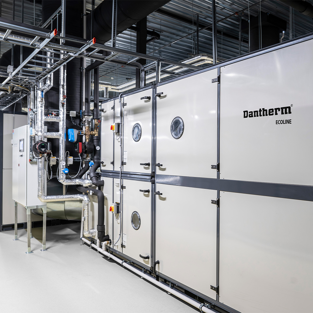 Dantherm ECOline offers ventilation, dehumidification, humidification, heating, and cooling integrated into a system. The exceptionally energy-efficient solution typically consists of the Dantherm DanX CF climate control unit with a counterflow heat exchanger with mixing section, EC fans, integrated cooling/heating coil, and a separate Dantherm SD adsorption dehumidifier. The system is equipped with autonomous control/automation in a separate electrical panel.